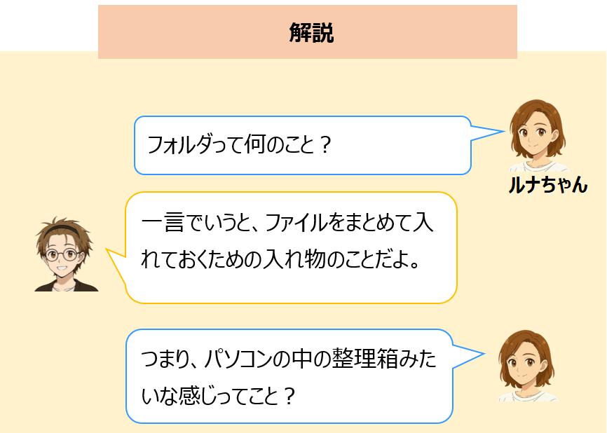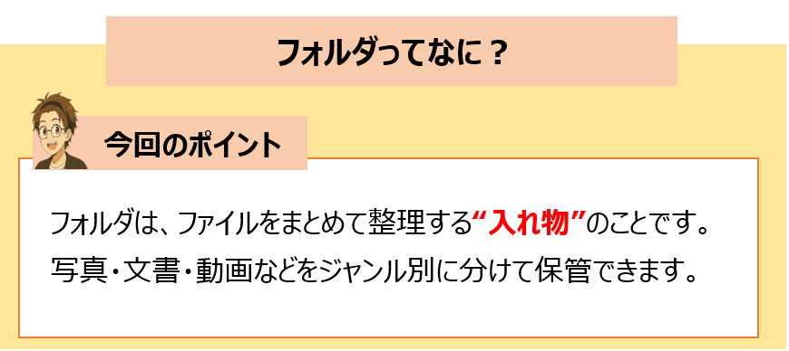 フォルダとは、紙の書類を入れる“引き出し”のようなもので、写真・文書・動画・プログラミングの練習データなど、さまざまな情報を整理して入れておくための場所です。