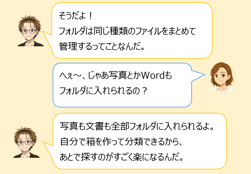 たとえば、インターネットからダウンロードしたファイルがバラバラに散らばっていると、どれがどれかわからなくなりますよね。そこでフォルダを使うことで、必要なものをすぐに取り出せるように分類できます。