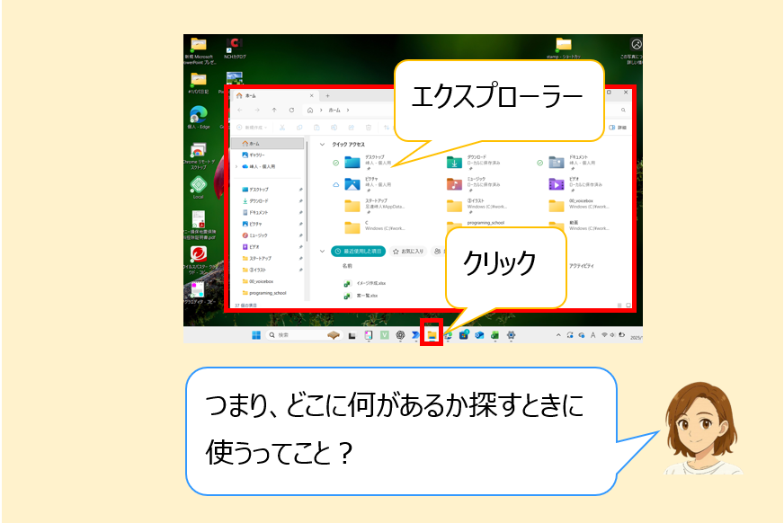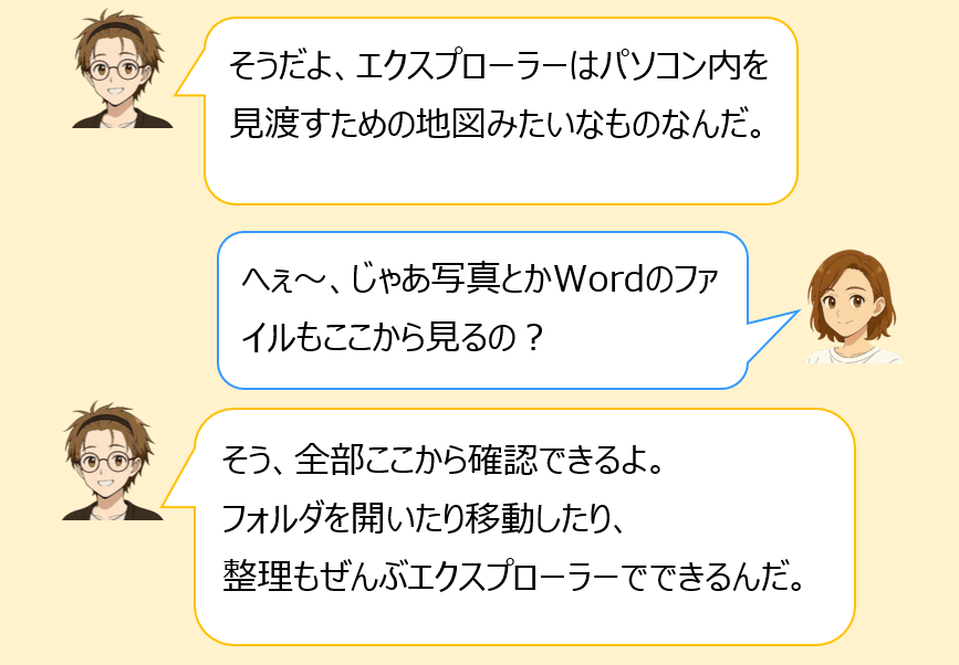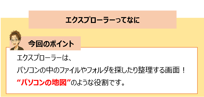 エクスプローラーとは、パソコンの中にあるファイルやフォルダを整理したり、開いたり、移動したりするための“部屋の案内役”のような存在です。