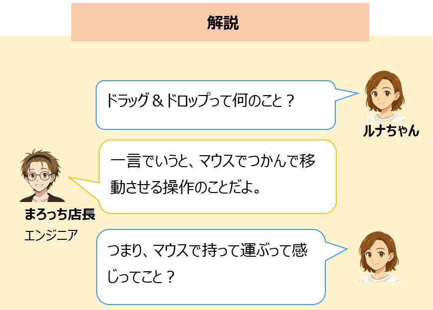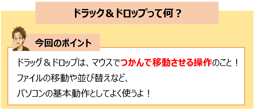 パソコン教室でよく登場する基本操作の一つに「ドラッグ&ドロップ」があります。
