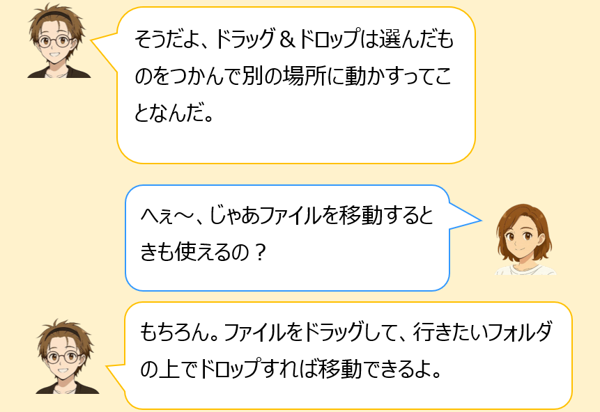 ドラッグ&ドロップとは、マウスの左ボタンを押し続けて(=ドラッグ)、そのまま目的地まで動かし、最後にボタンを離す(=ドロップ)操作のことをいいます。画面の中のアイコンやファイルをつかんで移動させるイメージです。