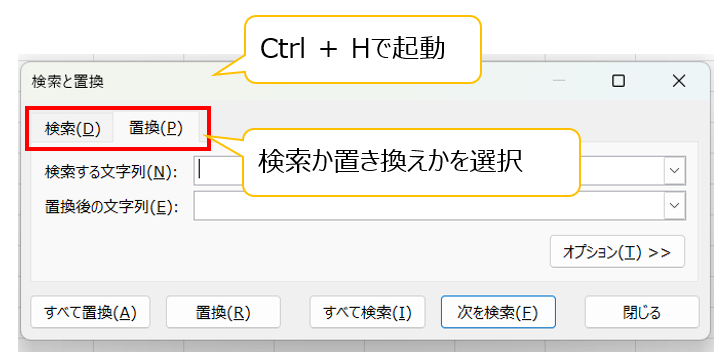 基本の使い方はとてもシンプルです。まず、Excelを開いた状態でキーボードの「Ctrl+H」を押します。すると「検索と置き換え」ダイアログボックスが表示されるので、「検索する文字列」に直したい元の文字(例:A株式会社)、「置換後の文字列」に変更後の文字(例:Aホールディングス)を入力します。あとは「すべて置換」を押せば、対象範囲のすべてが一度に書き換わります。「次を検索」「置換」を使えば、1件ずつ確認しながら変更することもできます。