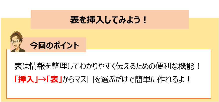 次のステップとして、行・列の追加、セルの結合、デザイン変更などを学びながら、より実践的な表作成に挑戦しましょう。